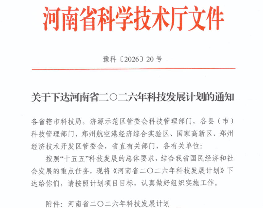 近日,河南省科技厅下发了《关于下达河南省二〇二六年科技发展计划的通知》(豫科〔2026〕20号),我院荣获立项软科学项目1项。